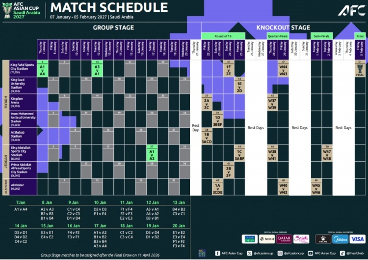 2027年沙特亚洲杯将于明年1月7日-2月5日在利雅得、吉达以及胡拜尔三座城市举行,可容纳72000名观众的利雅得法赫德国王体育城体育场将承办揭幕战以及决赛,这座球场还将承办多场小组赛以及1场1/4决赛。